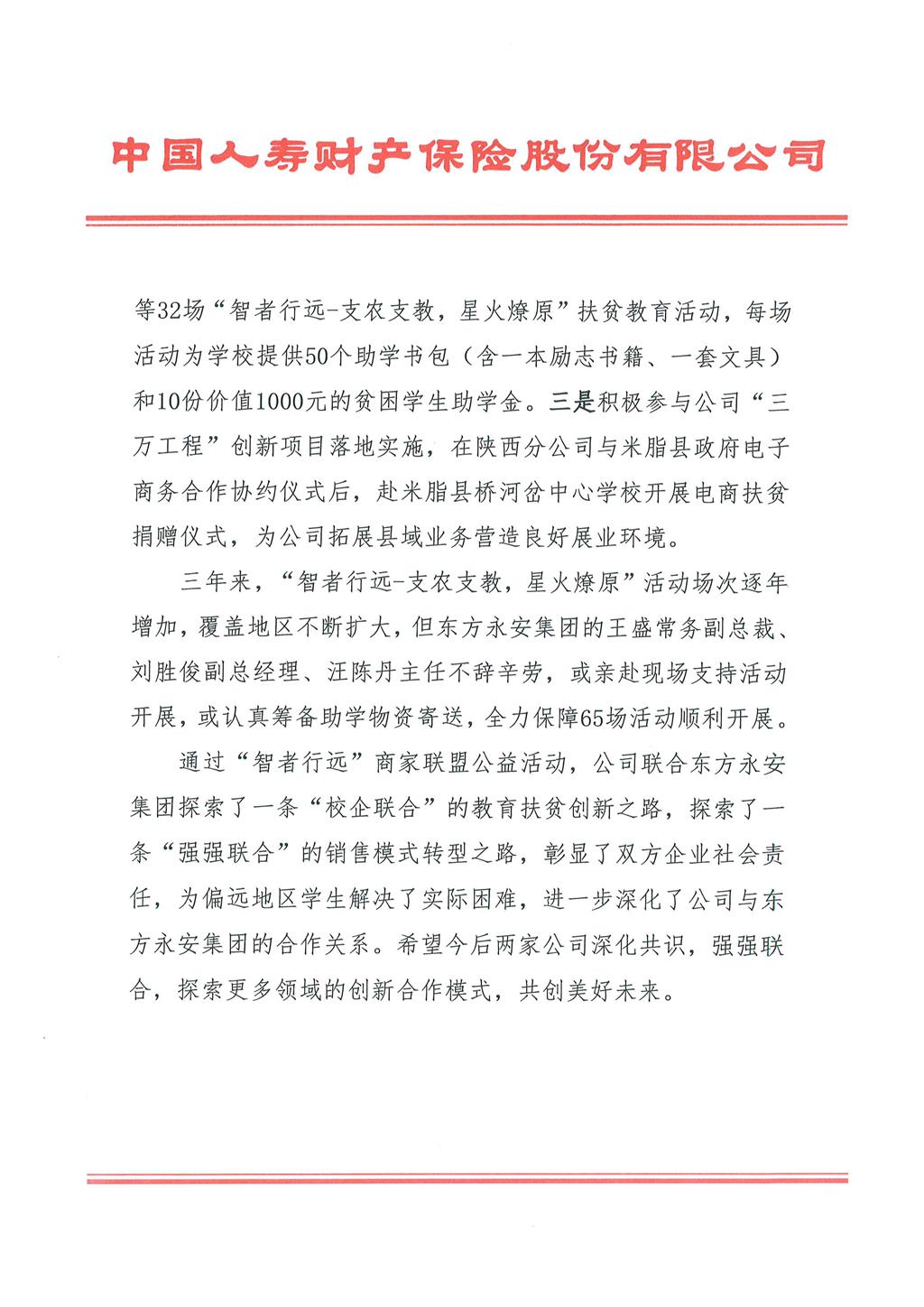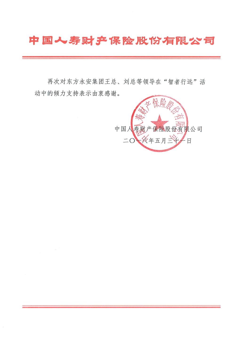 中国人寿财产保险股份有限公司致mansion88明升的感谢信